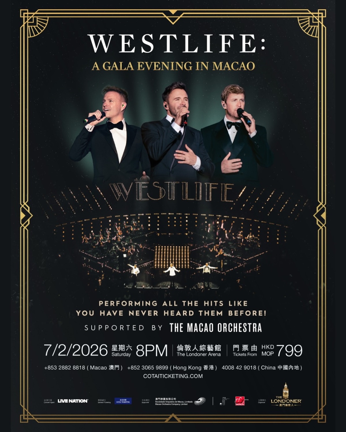 Legendary pop group Westlife will captivate fans like never before at The Londoner® Macao’s The Londoner Arena on February 7, 2026, with Westlife: A Gala Evening in Macao. Celebrating 25 years of music, the hit-filled performance with The Macao Orchestra presents a unique opportunity to witness the group’s iconic songs reimagined. Tickets will go on sale from 12p.m. on Dec. 16, 2025 (Tuesday) via Cotai Ticketing, Damai and Macau ticketing.