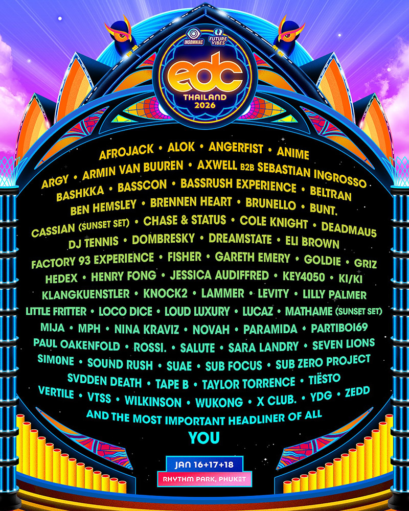 Electric Daisy Carnival - EDC Thailand 2026 has released its line-up for the 16th, 17th and 18th January 2026 at Rythmn Park, Phuket. Artists include ALOK, Armin Van Buuren, DJ Tennis and many more...