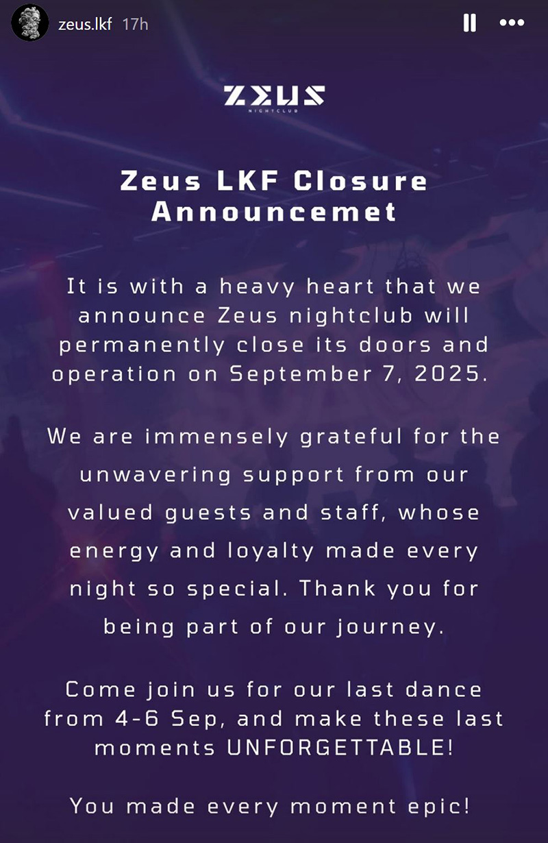 Zeus club in Lan Kwai Fong Central has confirmed that it will be closing on 7th September 2025 (this weekend). Past artists that have performed at the club have included Olly James, Bonka, Julian Jordan, Marnik, Darren Styles, Bassjackers, Headhunterz, Ferry Corsten, Ben Nicky, Sub Zero Project, Yellow Claw, Cosmic Gate and Steve Aoki.