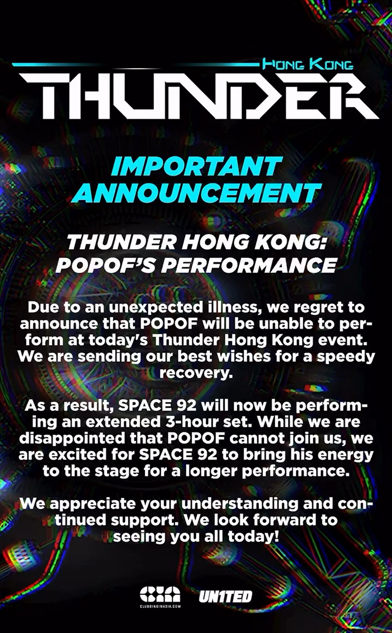 POPOF unfortunately can‘t make it to the show tonight in Hong Kong, due to illness. The announcement made by the event organiser today has said that SPACE 92 will now be delivering a 3-hour set.
