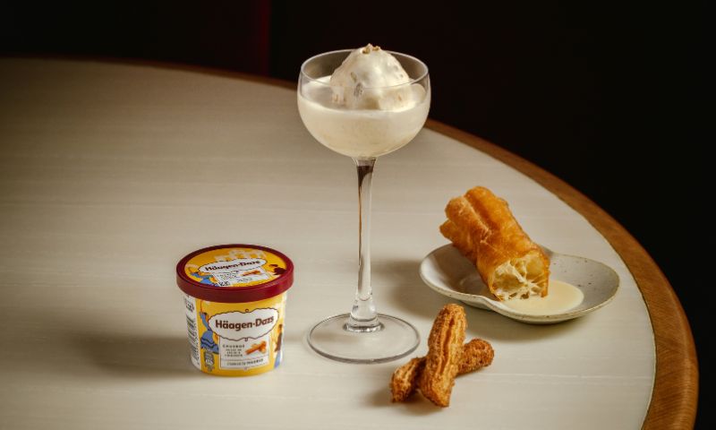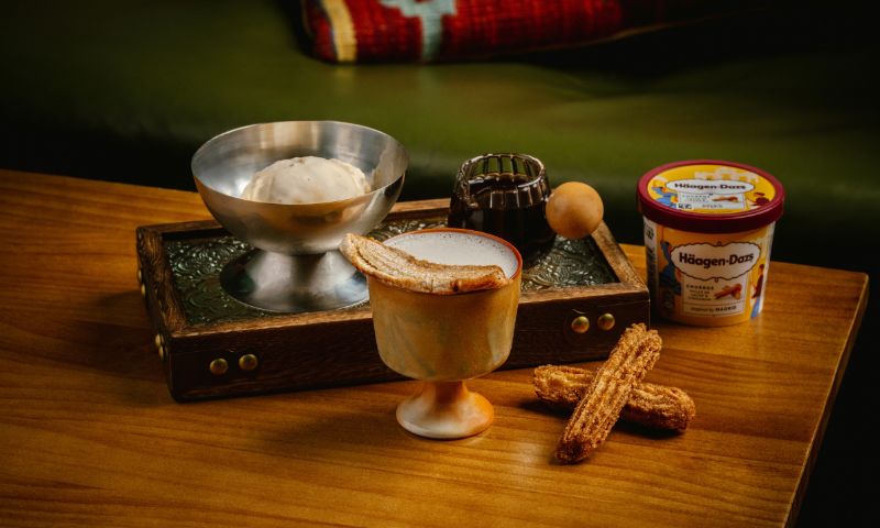 Churroni - Cocktail (HK$140) (Designed by Samuel Kwok) Wing Lee Wai’s Yuk Bing Siu, a traditional Cantonese rice wine infused with pork fat, evokes a taste of bygone Hong Kong. It’s paired with roselle liqueur from local brand Magnolia Lab for a sweet-tart balance that enhances the Häagen-Dazs™ Churros Dulce de Leche & Cinnamon Ice Cream’s creamy and spiced notes. Served with fried dough sticks and condensed milk, it captures the joy of a classic Hong Kong breakfast.