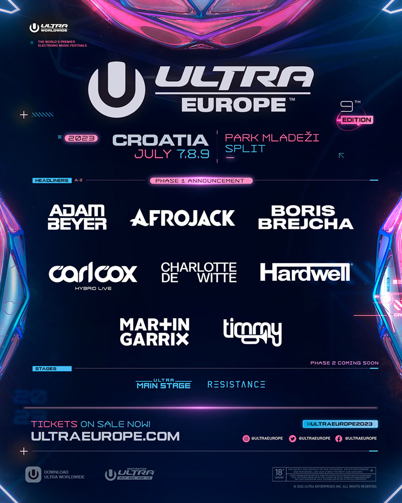 ULTRA Europe 2023 has released their phase 1 lineup for 2023. Taking place in Croatia for its ninth edition the event will take place from 7th to 9th July 2023.