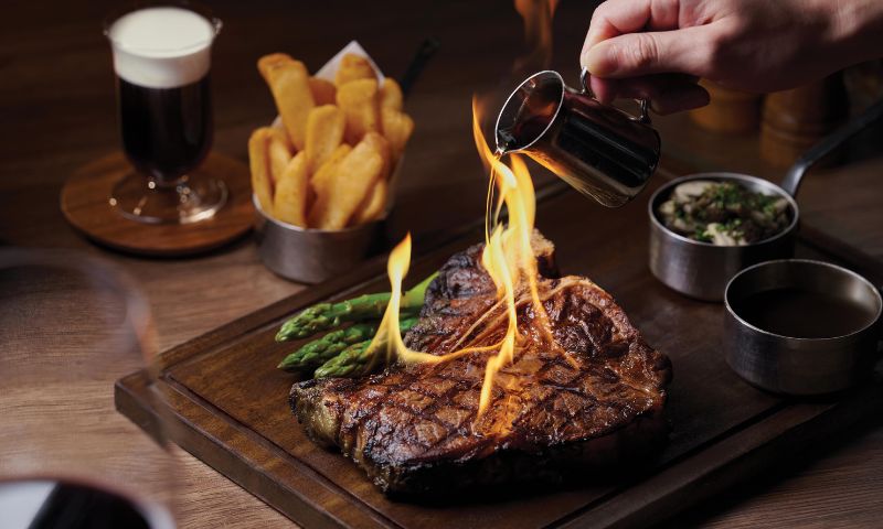 For the main event, a selection of the finest cuts awaits. Enjoy the USDA Nebraska Ribeye, Australian Jack’s Creek Striploin, Australian Stockyard Premium Black Angus Beef Tomahawk, or Australian Rangers Valley T-Bone. Each steak is meticulously grilled to perfection and served with a flavorful whisky steak sauce. To enhance the aroma and create a truly captivating feast, your steak will be flambéed tableside, erupting in a dramatic burst of flames.