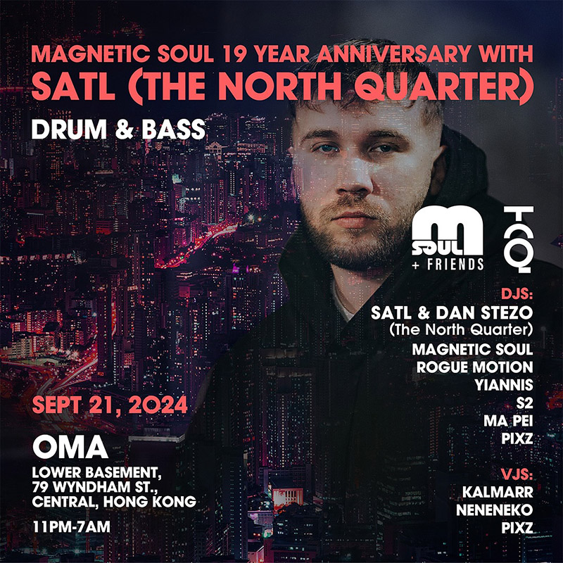 Get ready to celebrate 19 years of Magnetic Soul's legendary Drum & Bass events in Hong Kong! This Saturday, they are bringing you the deep, soulful, and liquid sounds of SATL (The North Quarter, Fokuz, Innerground, SGN:LTD, Integral).